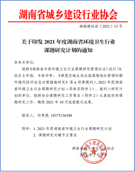 2021年2月4日,我司“高級非膜法垃圾滲濾液處理技術(shù)的研究與應(yīng)用”課題列入 2021 年度湖南省環(huán)境衛(wèi)生行業(yè)課題研究計劃。